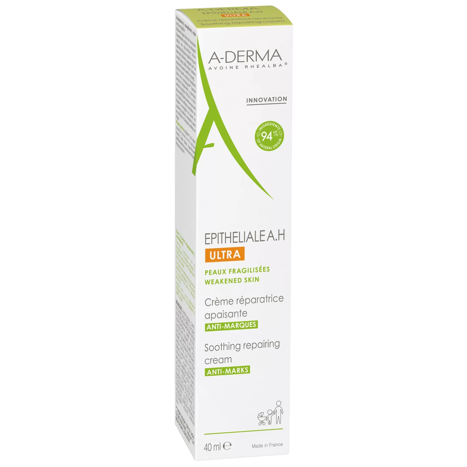Epitheliale A.H ULTRA Crème Réparatrice Apaisante d’A-Derma est un soin dermatologique conçu pour accélérer la réparation cutanée, atténuer les marques et apaiser les sensations désagréables. Grâce au complexe breveté Cicahyalumide®, elle hydrate intensément, favorise une cicatrisation plus rapide (jusqu’à 6 jours gagnés) et diminue l’apparence des marques. Sa formule à 94 % d’ingrédients d’origine naturelle, sans parfum et vegan, convient aux peaux fragilisées de toute la famille, y compris les nourrissons.