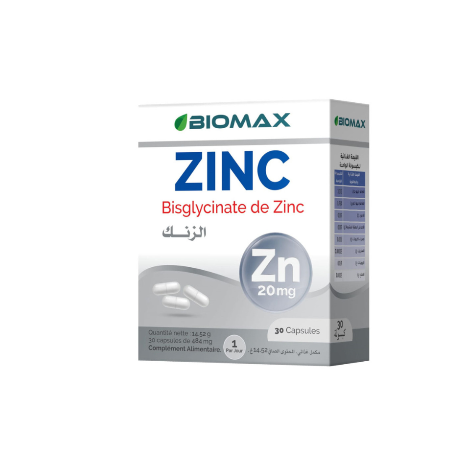 Biomax ZINC Bisglycinate de Zinc 20 mg est un complément alimentaire riche en zinc, un oligo-élément essentiel pour l’organisme. Sa forme de zinc bisglycinate favorise une absorption optimale, offrant des bienfaits pour la peau, les cheveux et les ongles. En aidant à neutraliser les radicaux libres, il lutte contre le stress oxydatif, préservant ainsi la santé cutanée. Chaque capsule contient 20 mg de zinc sous forme de bisglycinate, offrant un soutien efficace pour un organisme équilibré.