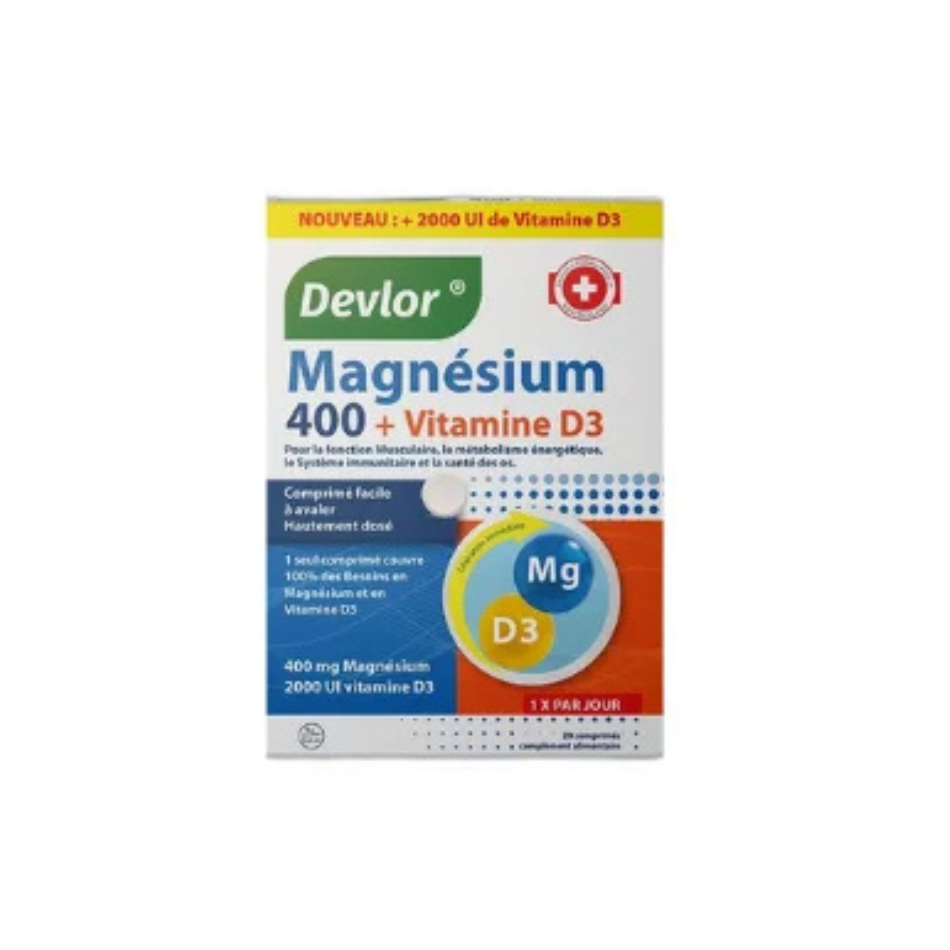 Le Devlor Mag 400 + D3 est un complément alimentaire combinant 400 mg de magnésium et de la vitamine D3. Il est conçu pour soutenir le fonctionnement musculaire, réduire la fatigue et favoriser un bon équilibre nerveux. La vitamine D3 contribue également à renforcer les os et le système immunitaire, faisant de ce produit un allié complet pour le bien-être quotidien.