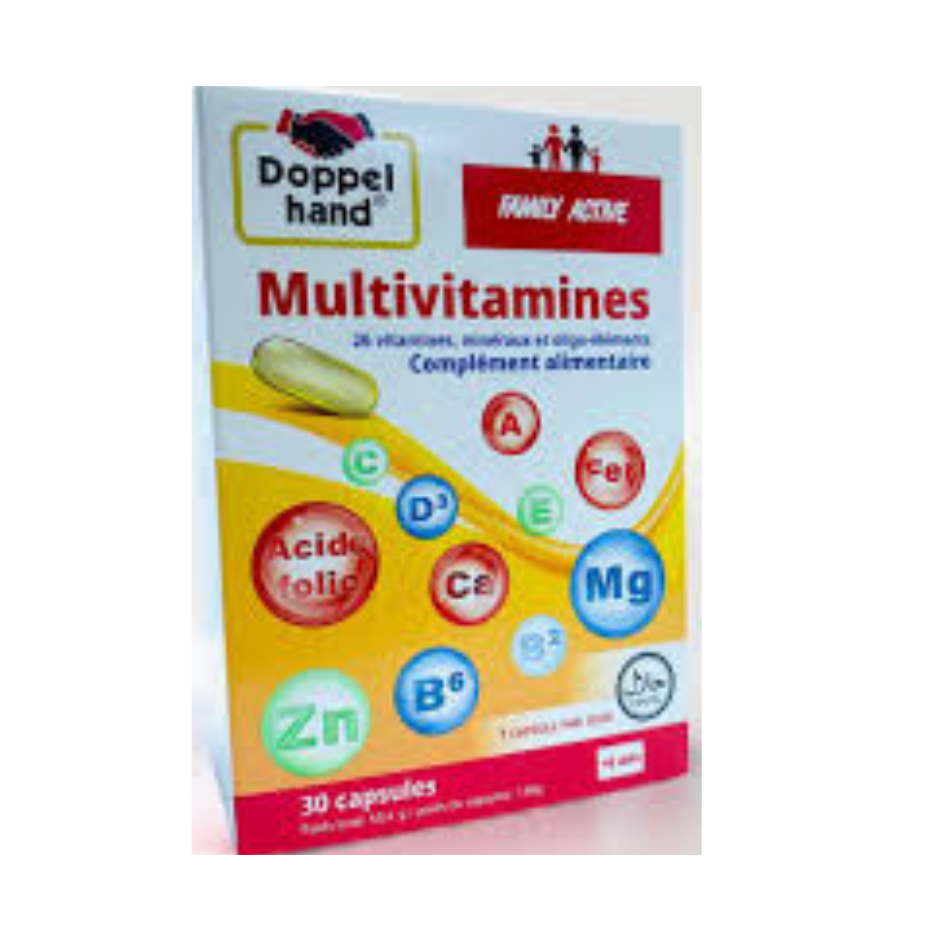 Doppel hand® FAMILY ACTIVE, un complément alimentaire en capsules, offre une source complète de vitalité avec 26 vitamines, minéraux et oligo-éléments, incluant la vitamine K, l’acide folique, la vitamine D3, E, le fer, le calcium, le magnésium, le zinc, la vitamine B6, B2. Une capsule par jour, adaptée aux enfants de 6 ans et plus, pour une santé optimale. Profitez de l’équilibre nutritionnel en toute simplicité avec Doppel hand® FAMILY ACTIVE.